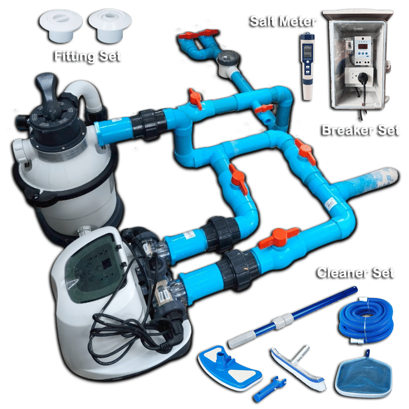 ระบบเกลือ ประกอบเป็นแบบรถเข็นเคลื่อนย้ายได้ใช้งานชั่วคราว ใช้งานได้กับสระขนาดไม่เกิน 30 คิว เหมาะกับติดตั้งและใช้งานชั่วคราว